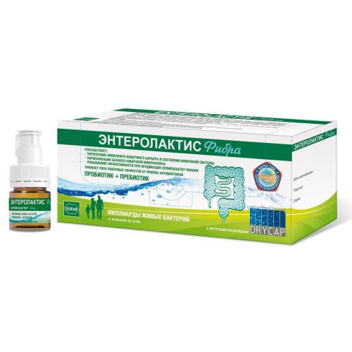 ЭНТЕРОЛАКТИС Фибра способствует: - нормализации баланса кишечной микрофлоры; - укреплению иммунного кишечного барьера и улучшению функционального состояния иммунной системы организма; - повышению эффективности при эрадикации Хеликобактер пилори (Helicobacter pylori); - устранению нарушений поведения и эмоциональных расстройств, улучшению настроения. Снижает риск побочных эффектов от приёма антибиотиков. ЭНТЕРОЛАКТИС Фибра - это комбинация пробиотика (Lactobacillus paracasei, штамм CNCM I-1572 (L. casei DG)) и пребиотика (фруктоолигосахариды), которая способствует восстановлению нормальной микрофлоры кишечника и препятствует росту потенциально вредоносных бактерий.